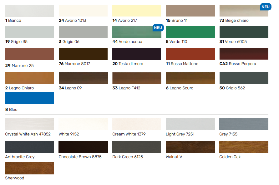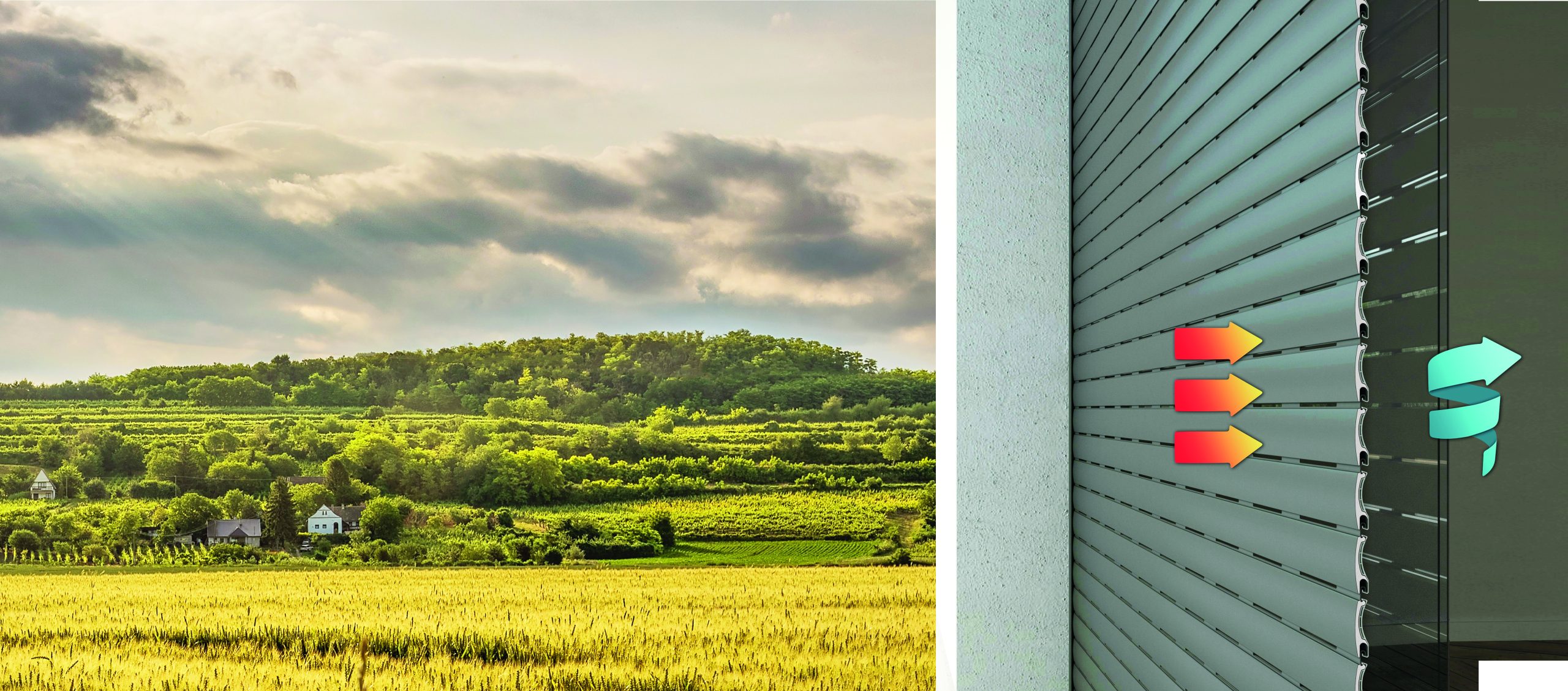 PVC Rollladen. Dieser wurde mit der Innovation eines ARIALUCE verbunden und mit langen Lichtschlitzen versehen. Der zentrale Hohlraum zwischen den beiden Profilen erzeugt eine höchst effektive